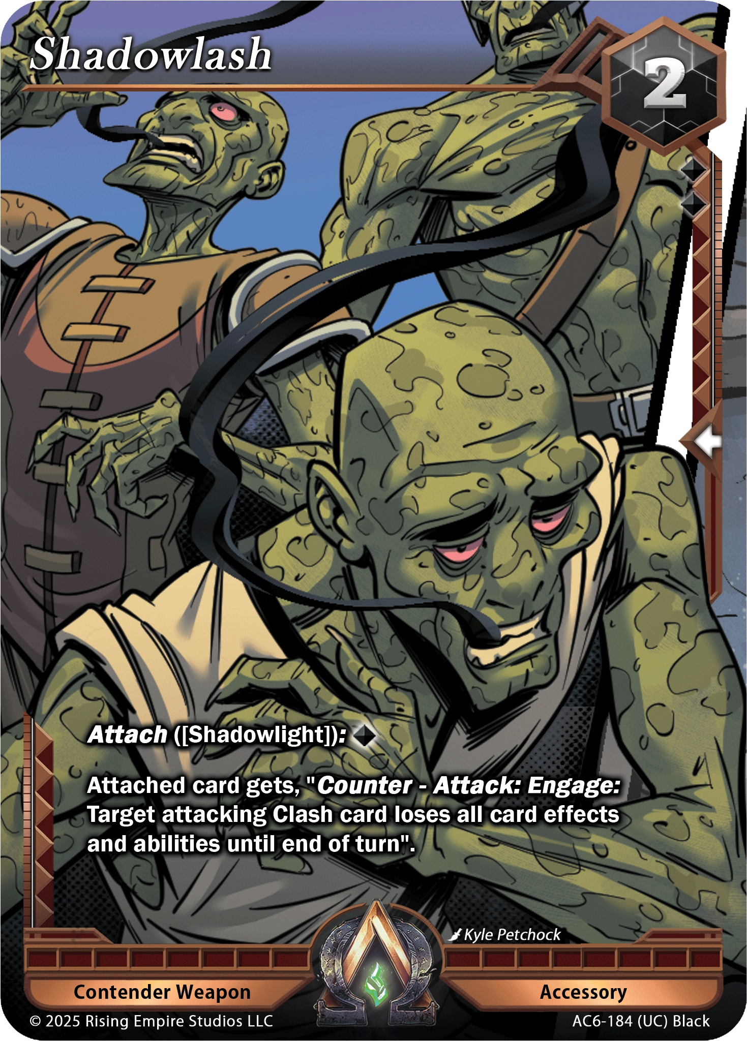 Updated Text: Attach: ⯁. Attached Contender gets, “Counter – Attack: Engage this Contender. If you do, target attacking Clash card loses all effects and abilities until end of turn.” This Weapon can only be attached to a [Shadowlight] Contender.