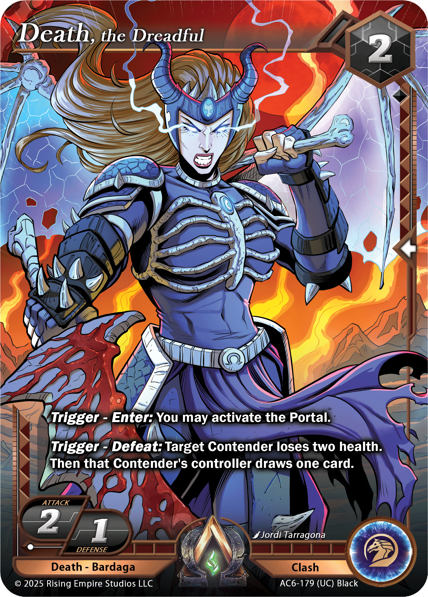 Updated Text: If this card deals clash damage to a Contender, you may deal three damage to another target Clash card you control. If that Clash card is defeated by this effect, you may deal X damage to target Clash card or Contender, where X is equal to the defeated Clash card’s initial resource cost.