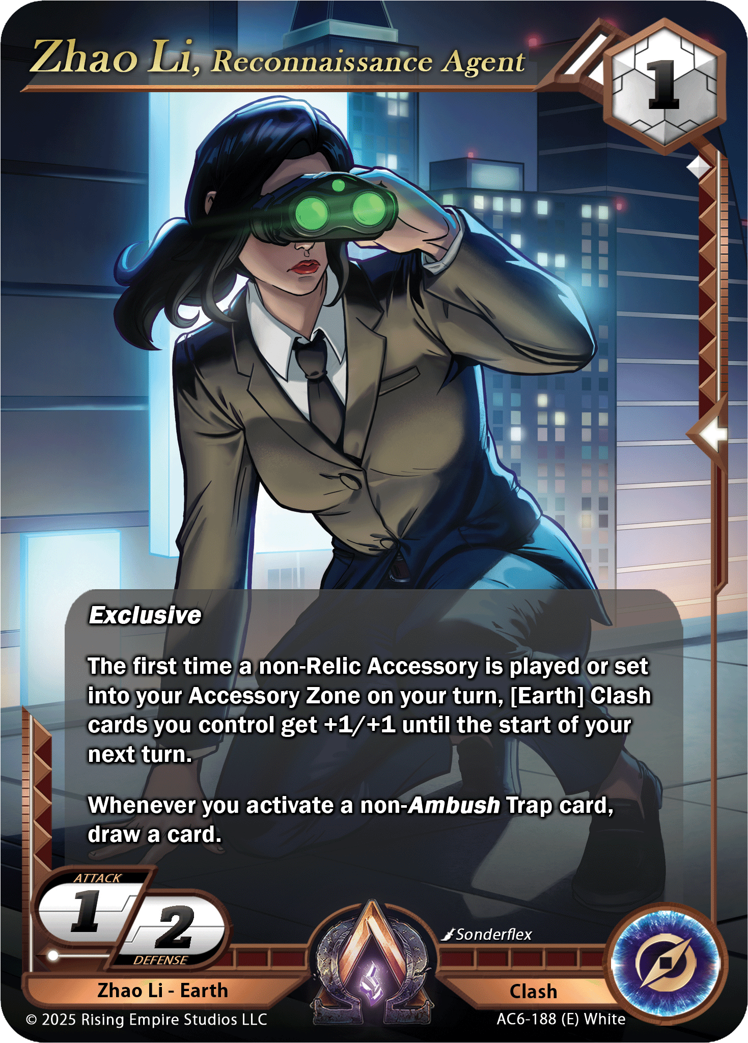 Updated Text: Exclusive. The first time a non-relic Accessory is played or set into your Accessory Zone on your turn, [Earth] Clash cards you control get +1/+1 until the start of your next turn. Whenever you activate a non-Ambush Trap card, draw a card.
