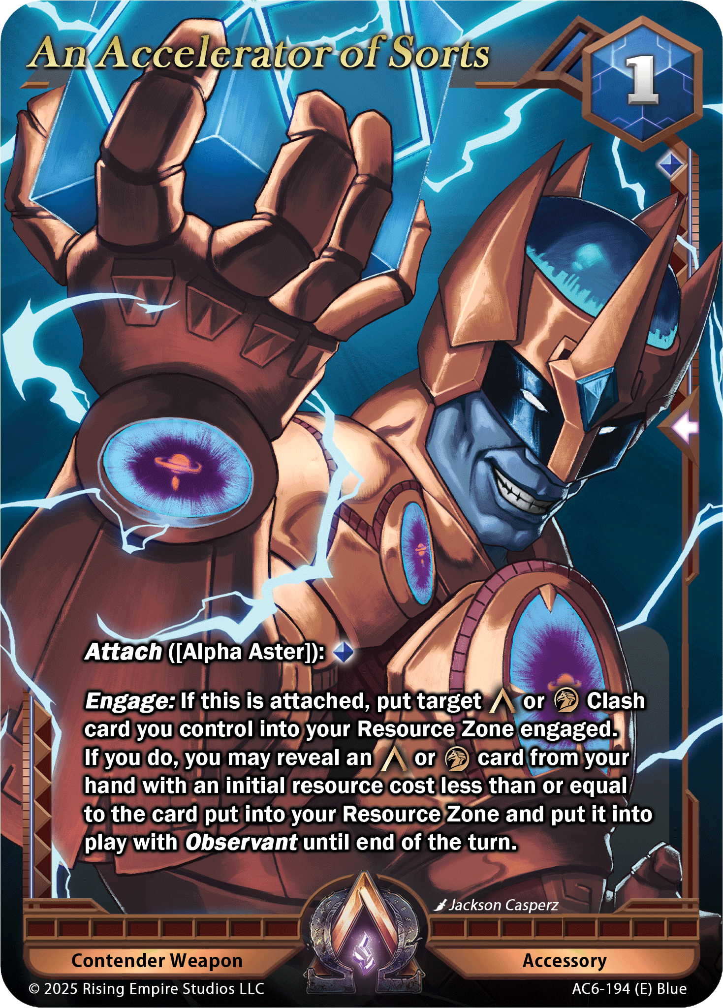 Updated Text: Attach: [Blue Resource]. Attached Contender gets, “Once per turn, during your Primary Phase, you may engage attached [An Accelerator of Sorts]. If you do, put target (Alpha) or (Harbinger) Clash card you control into your Resource Zone engaged. If you do, you may reveal an (Alpha) or (Harbinger) Clash card without Unrivaled from your hand that has an initial resource cost less than or equal to the targeted Clash card and put it into play. It gets Observant until end of turn.” This card can only be attached to an [Alpha Aster] Contender.