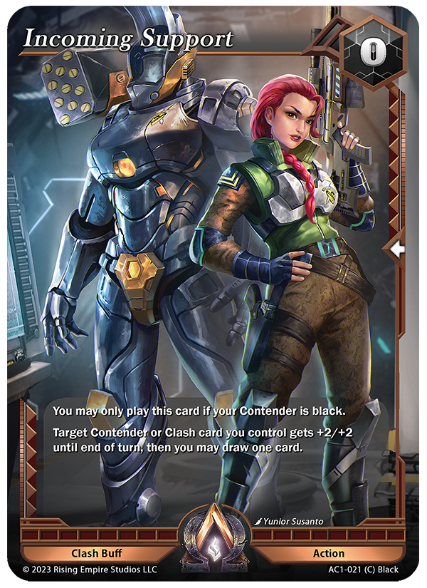 Incoming Support (AC1-021) and Energy Explosion (AC1-120) are both missing the stipulation regarding their Contender Affiliation, unlike the other three Buffs in the cycle. This oversight unintentionally makes these cards much stronger than intended when taking new and future Contenders into account. To save these cards in the environment of the game, we have elected to revert them back to their original intended design, to keep them in line with the rest of the Buffs from the set, rather than ban them. From today onwards, these buffs will now read as follows: